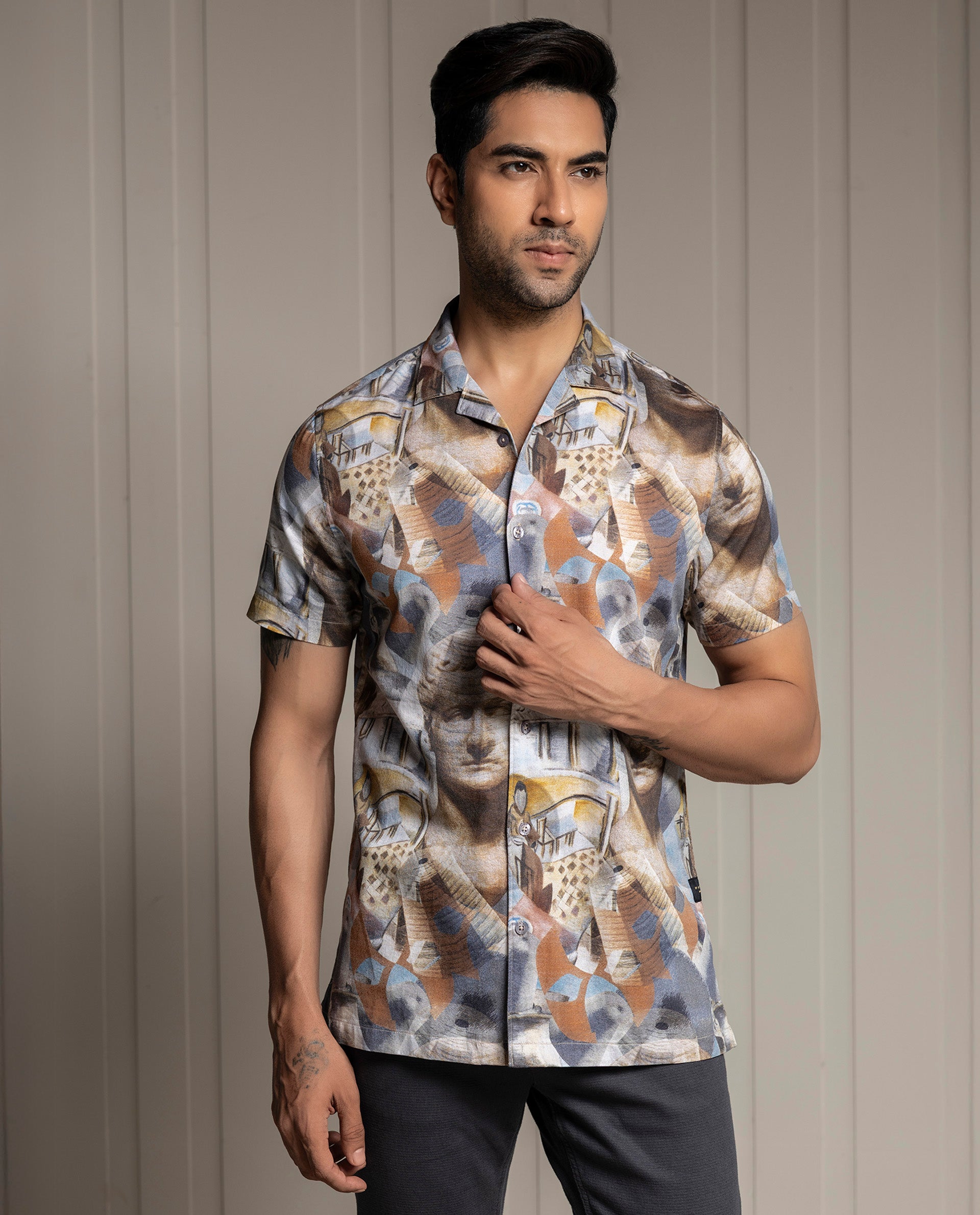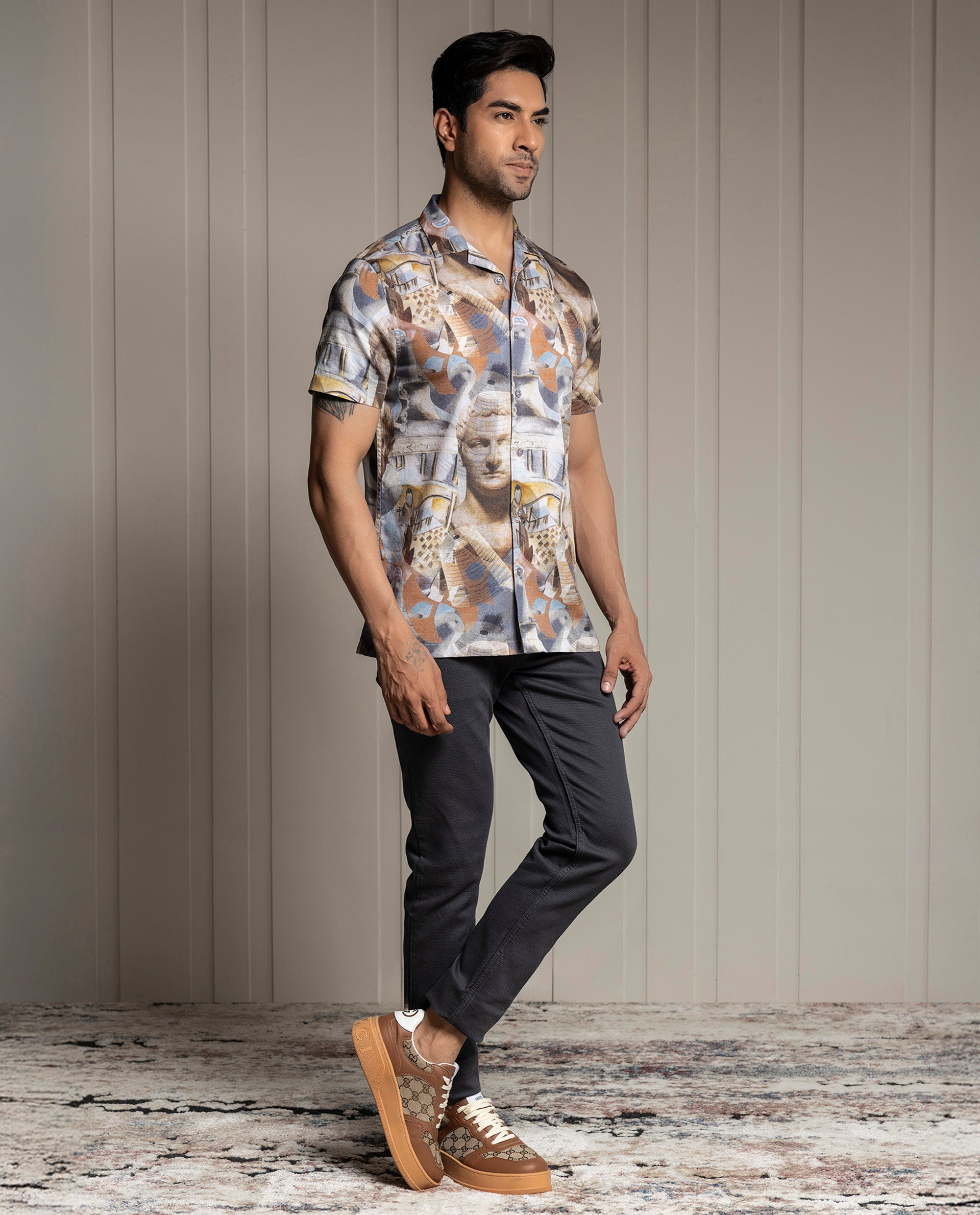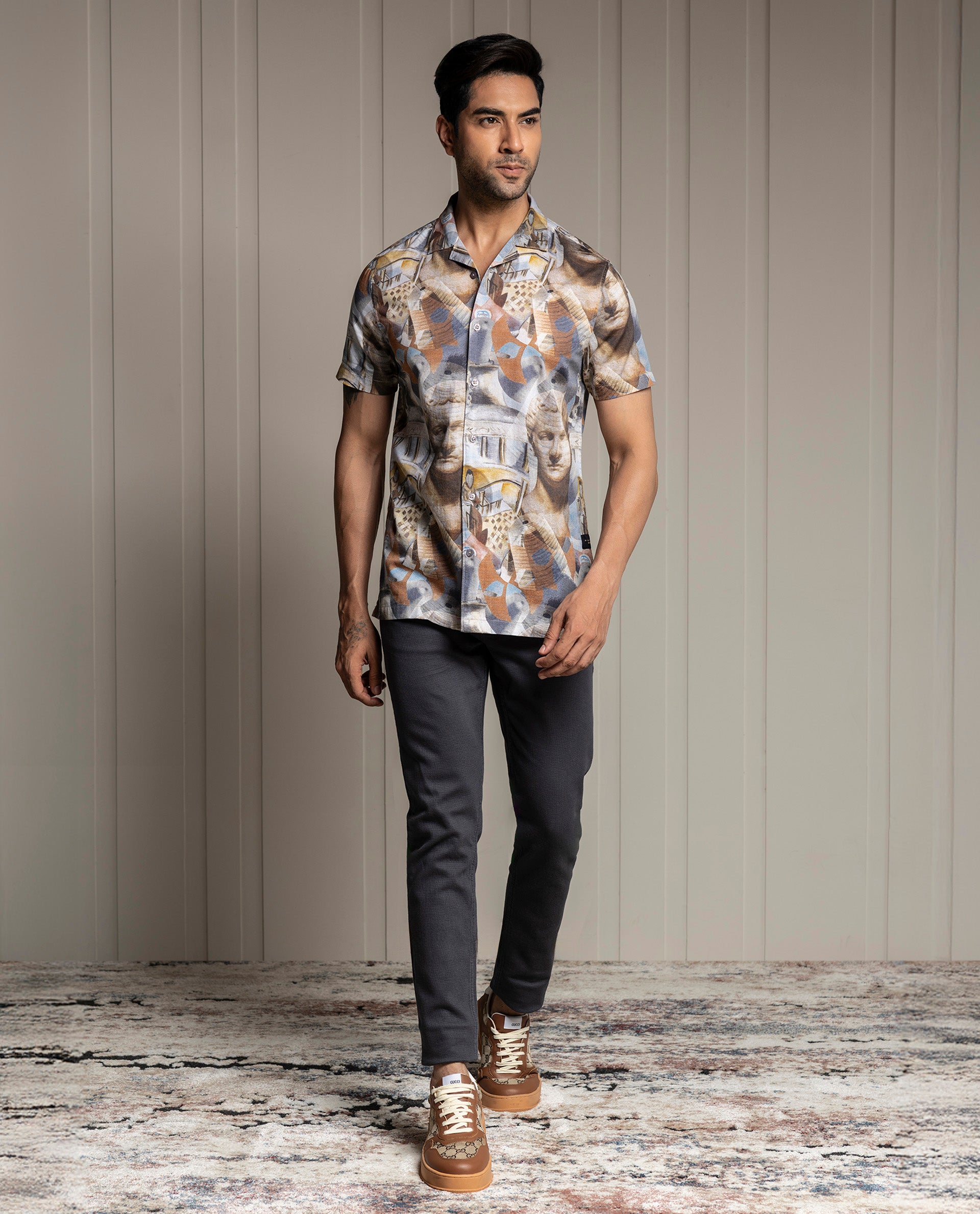 MODERN - GRAY - RESORT COLLAR - DIGITAL PRINT PARTY WEAR SHIRT